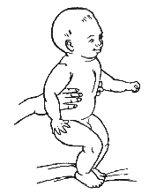 2. Рефлекторная "ходьба". Поддерживая ребенка под мышки и слегка наклоняя его вперед, нужно вызвать шаговый рефлекс, направляя движения от себя.