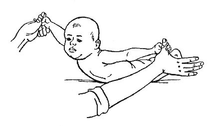 9. И. п. - ребенок лежит на животе. Уложить ребенка на край стола так, чтобы грудь и голова его были вне стола. При этом взрослый придерживает ребенка за таз и ноги. В таком положении ребенок должен разогнуть шею и туловище, поднимая их выше стола, образуя дугу, открытую вверх. Руки ребенка выпрямляются и выдвигаются вперед. Движение нужно стимулировать словом, игрушкой, помочь точечным массажем спины.