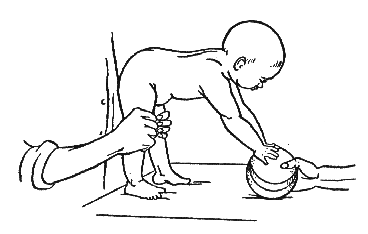 8. И. п. - ребенок стоит на столе, лицом к взрослому. Стимулирование пере-ступания в возрасте 7 месяцев при поддержке за подмышки (1-3 раза), в возрасте 8-9 месяцев - при поддержке за кисти обеих рук, за кольца.