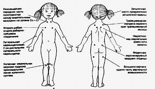 Болевые точки у детей с фибромиалгией более чувствительны к давлению, чем точки в тех же местах у здоровых детей и безболезненные (контрольные) точки у этого же пациента. Контрольные точки - участки тела, которые при надавливании безболезненны - располагаются в средней части лба, волярной поверхности средней трети предплечья, средней части передней поверхности бедра, ногте первого пальца кисти. При этом контрольные точки безболезненны у детей с фибромиалгией, в отличие от лиц, страдающих соматическими расстройствами.