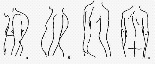 Изменения формы спины: а - сутулая; б - поясничный лордоз; в - сколиоз