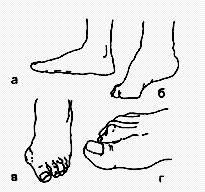 Изменения формы стопы: а - плоская стопа; б - высокая стопа; в, г - деформация пальцев стопы