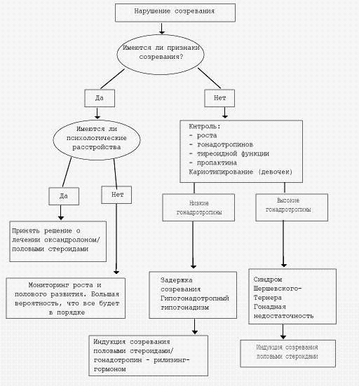 Наибольшую сложность для диагностики представляют две формы задержанного пубертата - задержка полового созревания конституционального характера и изолированный ги-погонадотропный гипогонадизм, тогда как гонадные формы гипогонадизма легко диагностируются по резкому повышению ЛГ и ФСГ уже в раннем пубертатном возрасте (10-11 лет). Конституциональная задержка пубертата и гипогонадотропный гипогонадизм характеризуются одинаково сниженными уровнями гонадотропинов и половых стероидов. Одним из самых достоверных диагностических тестов, разделяющих эти два состояния, является тест с определением дневной и ночной секреции ЛГ. В период сна у детей с конституциональной задержкой полового созревания уровень ЛГ значительно выше даже при отсутствии каких-либо признаков пубертата. У детей с центральным гипого-надизмом никакой разницы между ночной и дневной секрецией ЛГ не отмечено. Высокую диагностическую ценность имеет также тест с аналогами люлиберина 24-часового действия (нафаре-лином, бусерелином). Введение аналога стимулирует достоверный подъем ЛГ через 6-8 ч у детей с конституциональной задержкой и не влияет на уровень ЛГ у детей с гипогонадотропным гипогонадизмом. Алгоритм мониторинга детей с нарушениями полового созревания приведен на рис.