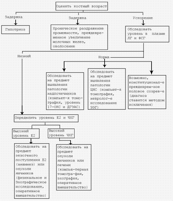 У мальчиков при сольтеряющей форме адреногенитального синдрома появляются рвота, шок и электролитный дисбаланс в возрасте 7-10 дн. У лиц мужского пола без признаков избыточного выведения соли из организма нарушение проявляется признаками преждевременного изосексуального развития. При рождении ребенок выглядит нормальным, но признаки преждевременного полового и соматического развития могут проявиться уже на первом полугодии жизни или развиваются более медленно и становятся очевидными только в возрасте 4-5 лет и позднее. К числу таких признаков относятся: увеличение полового члена, мошонки, появление волос на лобке, угри, запах пота, понижение тембра голоса. Яички нормального размера, но по сравнению с увеличенным половым членом кажутся маленькими. Мышечная система хорошо развита, костный возраст опережает хронологический. Умственное развитие не страдает, но из-за особенностей физического развития возможны аномалии поведения. Преждевременное закрытие эпифизов приводит к раннему закрытию зон роста и в итоге к низкоросл ости. Алгоритм мониторинга детей с ускоренным половым созреванием приведен на рис.