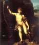 Продолжателя традиций итальянского Возрождения Гвидо Рени (1575 - 1642) больше привлекают мягкие, слегка женственные мужчины, с красивыми и тонкими чертами лица. Кажется, единственная картина Гвидо Рени с полной фронтальной наготой - "Вакх и Ариадна" (1619-20, Лос Анджелес). Картина "Аталанта и Гиппомен" (1618-19, Прадо, рис.66) изображает убегающего от девушки нежного юношу, чресла которого довольно искусственно прикрыты кончиком плаща. Даже библейский "Торжествующий Самсон"" (1618-19, Болонья, Национальная пинакотека, рис.67), который по определению должен быть воплощением мужественности, у Гвидо Рени - не зрелый муж, а молодой красавец, который только что разорвал свои цепи и горделиво попирает ногой тела убитых врагов. Так же красивы, юны и элегантны его Святые Себастьяны , из которых самый знаменитый (1615-16) находится в Генуе (Палаццо Россо), второй - в Прадо (1617-18), третий в Болонье (Пинакотека,1639-40), и Иоанны Крестители (рис.68). Но кисти Гвидо Рени принадлежит также "История Геракла" из 4 больших картин (Лувр), персонажи которой замечательны прежде всего своей мощью и физической силой.