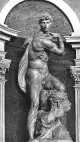 Были и попытки прямого подражания Микеланджело. В мраморной группе известного флорентийского мастера Винченцо Данти (1530 - 1576) "Честь торжествует над Ложью" (1561, Барджелло) (рис 39) молодой атлет, подобно "Победителю" Микеланджело, гордо попирает коленом старика в маске. Но в отличие от размышляющего и грустного "Победителя", лицо этого красавца выражает только жестокое торжество, и в целом скульптура , при всем ее великолепии, чем-то напоминает реслинг.