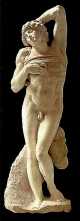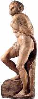 Вообще Микеланджело, в отличие от большинства художников, не отдает явного предпочтения какому-то одному типу мужского тела. Он не только противопоставляет тяжелую, сильную мужественность юной и элегантной, но и сочетает их в одном и том же образе. Его "Победа" (1530-33) рис 23, символизирующая торжество юности над старостью, вместе с тем проникнута грустью. Кажется, что юноша, попирающий поверженного старика, задумался о смысле собственной победы. Недаром эту скульптуру ассоциируют с любовью старого художника к молодому красавцу Андреа Кавальери.