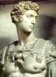 Микеланджело одинаково волнует как победоносное, так и страдающее, связанное, плененное мужское тело. Если фигура "Умирающего раба " (1514, Лувр, рис.24) выражает идею пассивности перед лицом судьбы, то "Восставший раб" (рис.25) пытается бороться с ней. Микеланджело наслаждается изображением развитой мужской грудной мускулатуры - "Джулиано Медичи" (рис. 26). Однако его персонаж может быть и не быть героическим, а просто веселым - "Вакх" (рис.27)