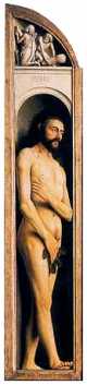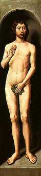 Полностью (за исключением гениталий) обнаженное мужское и женское тело, в образах Адама и Евы, появилось в Германии в 1430 -х годах. Самые известные деревянные скульптуры Адама и Евы - братьев ван Эйк (1432, Гент)(рис. 46) и Ганса Мемлинга (1479, Венский музей, рис.47). У обоих мастеров бородатые Адамы стыдливо прикрывают гениталии рукой, их фигуры совсем не эротичны. "Адам" ван Эйков - мускулистый, крепко сколоченный ремесленник с плоской грудью, костлявыми ногами и широкими, загорелыми кистями рук.