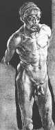 Главным новатором в изображении обнаженной мужской натуры был, конечно, Альбрехт Дюрер (1471-1528). В отличие от большинства своих современников, Дюрер не только реалистичен, но и психологичен. Его обнаженные тела на редкость пропорциональны и индивидуальны. У одного из его "Адамов" (1507, Прадо, рис.51) есть не только лобковые волосы, изображать которые многие художники стеснялись, но и выпуклый живот, что вовсе не лишает его привлекательности. Кроме библейских сюжетов, Дюрер рисовал обнаженное тело в бытовой среде ( знаменитые гравюры "Женская баня" и "Мужская баня" (около 1496).