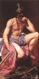 Самая замечательная картина из этой серии картин - "Марс" (1639-1642, Прадо, рис.78). Самый, по выражению одного современного искусствоведа, "негероический бог войны" устало сидит на розовой подстилке, на голове у него черная с золотом каска, чресла прикрыты плотным сиреневым платком, а у ног небрежно свалены грозные атрибуты его профессии. Поза Марса расслабленная, на лице усталость, загорелый торс контрастирует с белыми ногами. У Марса натруженные усталые руки, на ногах большие икры, на животе глубокие складки. Длинные жандармские усы выглядят воинственно, но одновременно смешно. Короче говоря, в нем нет ничего божественного, идеального или героического. Грозный римский бог войны низведен до положения простого и не особенно удачливого смертного. Если бы не его инсигнии, Марса вполне можно принять за современного пожарника или полицейского на отдыхе.