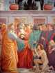 На совместной фреске "Святой Петр крестит новообращенных" (1425, Санта Мария дель Кармине) (рис.7) очень реалистично изображены двое прекрасно сложенных мускулистых молодых мужчин в плавках. Один стоит на коленях, принимая крещение, а другой ежится от холода. Тела совершенно живые и очень красивые. На другой фреске "Исцеление сына Теофила" (фреска осталась незаконченной, ее завершил в 80-е гг. XV века Филиппино Липпи) красивый юноша изображен полностью обнаженным ( рис. 8). Кстати, это выяснилось лишь в ходе реставрации в 1990 г., когда с фрески были удалены дописанные позднее и скрывавшие тело покровы и одежды.