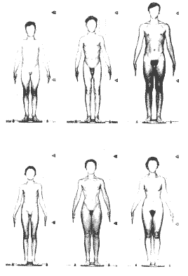 Неравномерность физического созревания подростков. Все эти подростки одного и того же возраста (мальчикам по 15, девочкам по 13 лет), но степень их половой зрелости различна