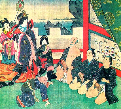 ![]() Японский рисунок на свитке (середина XIX века) изображает сцену из повести "Остров женщин", рассказывающей о судьбе группы потерпевшей кораблекрушение моряков. Как видите, размерам члена здесь придается немаловажное значение |