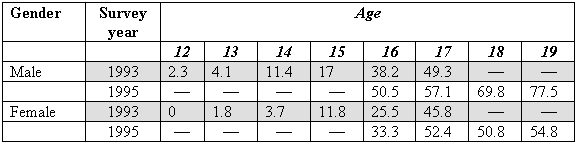Similar overall changes took place both in secondary and in vocational schools. This suggests that changes in the age of sexual first experiences cannot be treated as an event caused by changes in the sample design. We found further evidence of a dramatic change in sexual behavior between 1993 and 1995 when we analyzed answers to the question about age at first intercourse independently for different age groups within one and the same sample (survey of 1995). Among 16-year-old women, there were twice as many sexually experienced girls than was the case for the 19-year-old respondents when they were 16 (23% vs. 11%). The same difference was found between 17-year-old women and 19 year-olds who had been sexually experienced at 17 (45% versus 24% respectively) The same tendencies were observed among male students, although the changes were not as great.