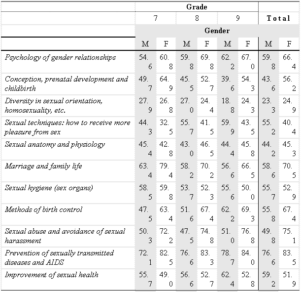 Table 2. Students' preferences regarding topics for a course in sex education (those who indicated a topic as 'very necessary',%), 1997 survey