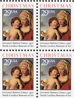 Абсолютный мировой рекорд ханжества в этом вопросе поставило почтовое ведомство США. Оно ежегодно выпускает серию марок "Мадонна с младенцем". В 1986 г. на марке была представлена написанная в 1500 году "Мадонна с Младенцем" (Флоренция, галерея Уффици) Пьетро Перуджино (1446-1523).